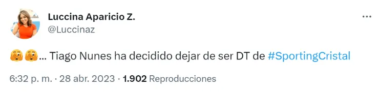 ¡ÚLTIMO MINUTO! El director técnico de Sporting Cristal, Tiago Nunes habría tomado la decisión de no continuar más como el entrenador del equipo cervecero. Esto fue informado por la periodista Luccina Aparicio de ESPN.