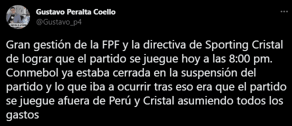 “Tras la anulación del toque de queda en Lima, el partido entre Sporting Cristal y Flamengo se jugará esta noche a las 20:00 hora local (22:00 hora de Brasil). El encuentro es por el Grupo H de la CONMEBOL Libertadores”. Fue lo que notificó, y les alegró la vida a muchos en la caja de comentarios.