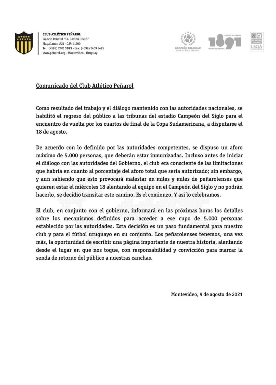El Peñarol frente a Sporting Cristal se juega con público. El gobierno de Uruguay autorizó la presencia de los hinchas ‘Carboneros’ para el encuentro de vuelta en el estadio Campeones del Siglo, donde los ‘charrúa’ son locales y se jugará el próximo miércoles 18 de agosto. La cantidad de público que podrá asistir al cotejo será de 5000 personas.
