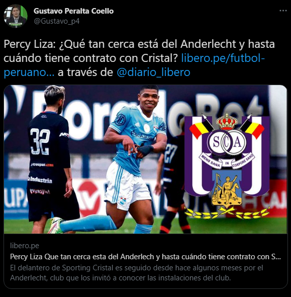 “Claramente, hay un interés del Anderlecht por Percy Liza, a quien ven como una de las figuras del futuro del fútbol peruano. Desde la directiva del club belga no descartan anunciar novedades en los próximos días. Además, desde el entorno del futbolista peruano precisaron que es “cuestión de tiempo””. Es lo que mencionó el medio de comunicación.