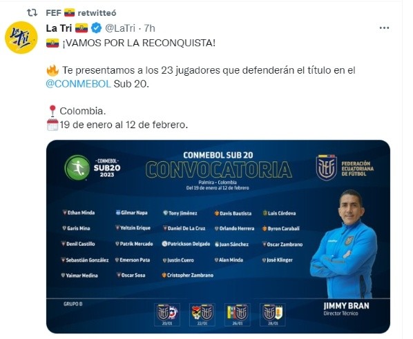 “¡Vamos por la reconquista! Te presentamos a los 23 jugadores que defenderán el título en el Torneo Sudamericano Sub 20. Colombia desde el 19 de enero al 12 de febrero”, compartió las redes sociales de la Selección de Ecuador.