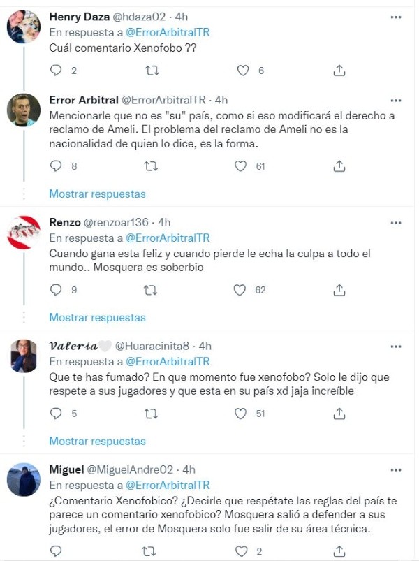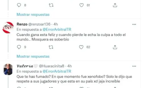 Tras la discusión entre ambos técnicos Roberto Mosquera dijo: “Date cuenta donde estás trabajando, este es mi país“, fue lo que dijo el reportero de Gol Perú en la transmisión. Luego de saberse lo dicho por el estratega celeste en las redes sociales se generó un debate donde indican que ambos deben recibir una sanción por la forma en que se comportaron, tanto el argentino, por ya tener discusiones muy parecidas con colegas y el peruano por las palabras que dijo hacia el extranjero.