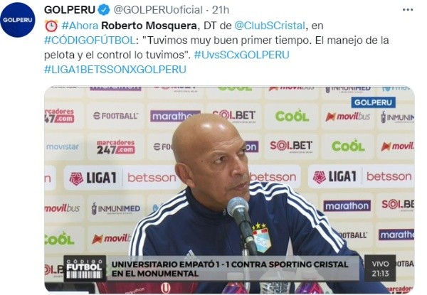 “Tuvimos muy buen primer tiempo, el manejo de la pelota, el control, las jugadas de gol, el gol que hicimos que fue válido. No estaba en offside (Nilson) Loyola; lo he visto, fue clarísimo”, declaró Roberto Mosquera sobre la falla del árbitro del compromiso de cara a la conquista del lateral izquierdo de Sporting Cristal, que pudo haber cambiado la historia del cotejo.