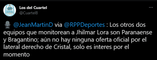 Por su parte, desde RPP Noticias, el comunicador Jean Martín Dueñas da su versión: “Los otros dos equipos que monitorean a Jhilmar Lora son Paranaense y Bragantino; aún no hay ninguna oferta oficial por el lateral derecho de Cristal, solo es interés por el momento”.