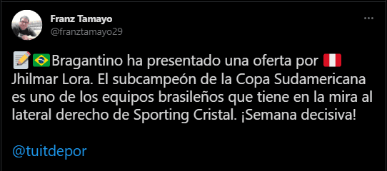El lateral derecho de Sporting Cristal podría cambiar de rumbo: “Bragantino ha presentado una oferta por Jhilmar Lora. El subcampeón de la Copa Sudamericana es uno de los equipos brasileños que tiene en la mira al lateral derecho de Sporting Cristal. ¡Semana decisiva!”.