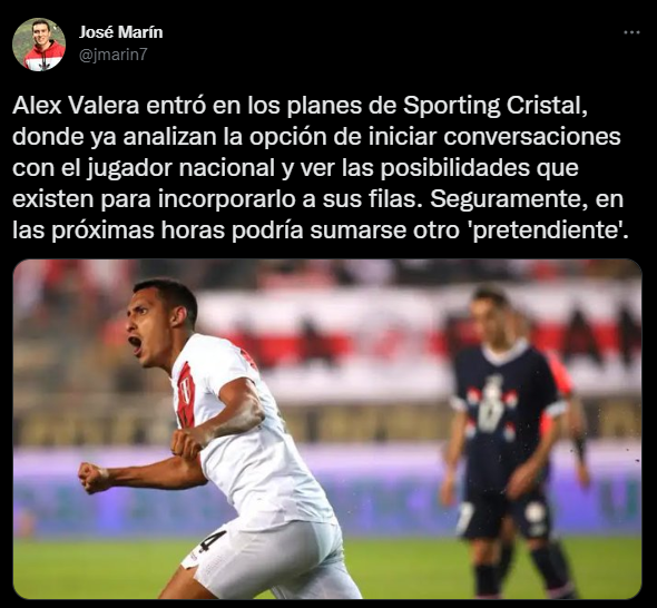 Lo informa el periodista deportivo, José Marín, quien en su cuenta de Twitter menciona: “Alex Valera entró en los planes de Sporting Cristal, donde ya analizan la opción de iniciar conversaciones con el jugador nacional y ver las posibilidades que existen para incorporarlo a sus filas. Seguramente, en las próximas horas podría sumarse otro ‘pretendiente'”.