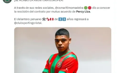 Anunciada su desvinculación de Marítimo CS de Portugal, el delantero Percy Liza tendrá que volver al Perú para jugar por Sporting Cristal. No llegando ofertas concretas por el delantero de 23 años, la dirigencia seguirá evaluando posibles destinos en una probable cesión.