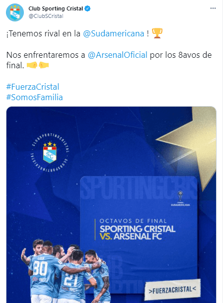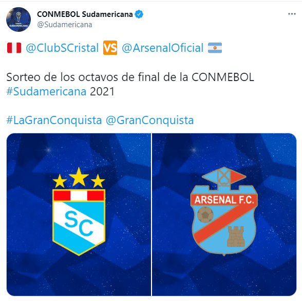 El cuadro de Roberto Mosquera batallará contra el conjunto argentino en esta fase de los octavos de final. El concepto presentado es el siguiente, la ida se jugará primero en Lima (Sporting Cristal), y la vuelta será en Argentina (Arsenal de Sarandí).