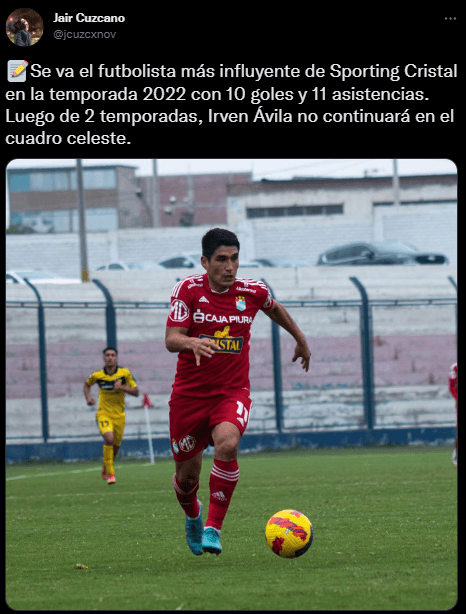 La información pura y dura presentada por el comunicador social, es la siguiente, seguramente aparecerá la nostalgia por parte del universo ‘rimense’, cuando se haga oficial: “Se va el futbolista más influyente de Sporting Cristal en la temporada 2022 con 10 goles y 11 asistencias. Luego de 2 temporadas, Irven Ávila no continuará en el cuadro celeste”.