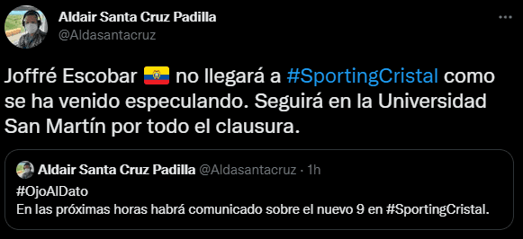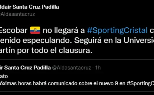 “Joffre Escobar no llegará a Sporting Cristal como se ha venido especulando. Seguirá en la Universidad San Martín por todo el clausura”. Con esto se estaría cayendo un nombre que se había especulado antes de la presentación de Diego Buonanotte. Habrá que esperar un poco más por las novedades en el club ‘bajopontino’.