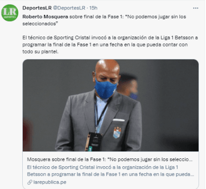 En declaraciones con RPP Noticias, el DT celeste sostuvo: “No es un tema de bulla, creo que no podemos entrar al camino de dar jugadores a la Selección con la ilusión de ayudar a Gareca y clasificar al Mundial, pero poniendo en riesgo la final de todo lo que hemos hecho. Hemos perdido un solo partido en todo el torneo y nos merecemos jugar con un equipo titular. Tendrán que mover la fecha de la final de la Fase 1”.