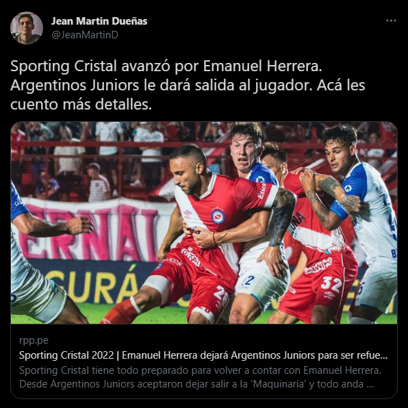 “Desde La Florida comenzaron indagando por la situación del argentino en La Paternal y su deseo de querer volver al fútbol peruano. Y así fue, el atacante no está cómodo en Argentinos Juniors, quiere retornar a tienda rimense y, además, ya habló con el técnico Roberto Mosquera, quien está seguro de volver a contar con el jugador”. Informa el medio de comunicación.