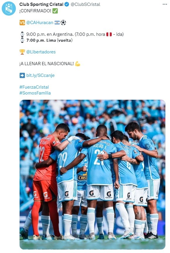 Así se confirmó vía redes sociales de Sporting Cristal. Haciendo una publicación en su cuenta de Twitter, la institución celeste motivó a sus hinchas a comprar las entradas para jugar el jueves 16 de marzo ante Huracán de Argentina en el estadio Nacional.