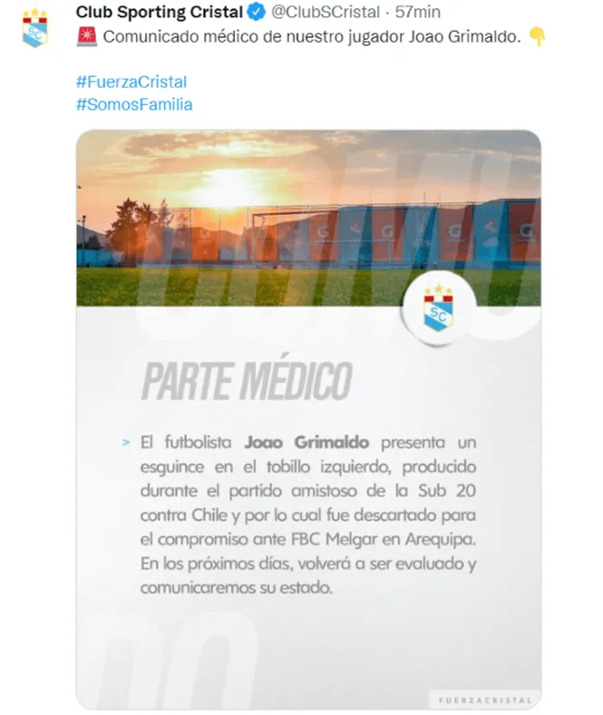 “El futbolista Joao Grimaldo presenta un esguince en el tobillo izquierdo, producido durante el partido amistoso de la Sub-20 contra chile y por lo cual fue descartado para el compromiso ante FBC Melgar en Arequipa. En los próximos días, volverá a ser evaluado”, señala el parte médico del cuadro celeste.