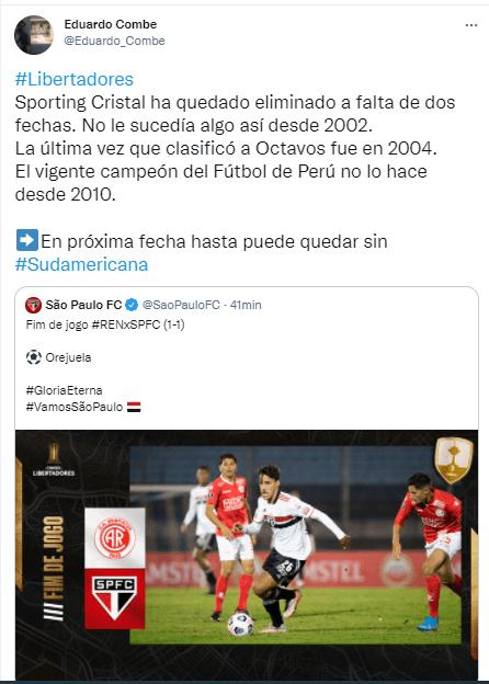 Sporting Cristal una vez más quedará fuera de los ansiados octavos de final de la Copa Libertadores, el proceso de Roberto Mosquera en 2021 no tendrá el final deseado en este torneo continental. Tras concretarse el empate a 1 entre Rentistas y São Paulo, los rimenses solo deberán pensar en Copa Sudamericana, y siendo optimistas.