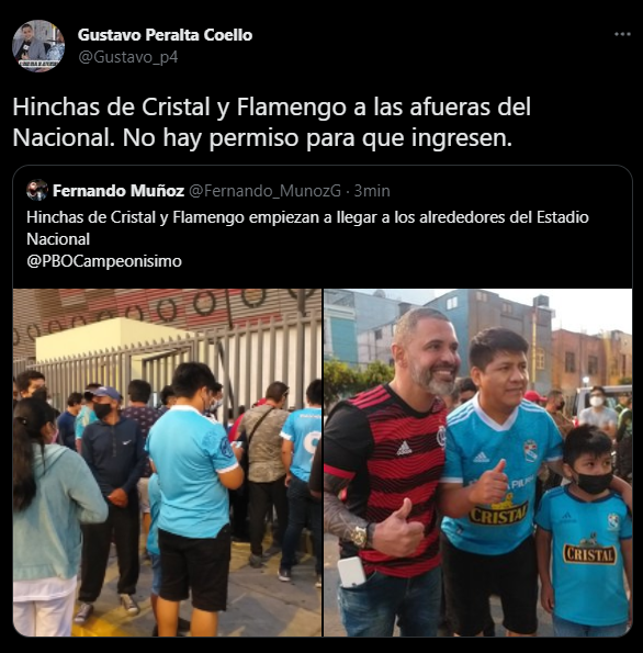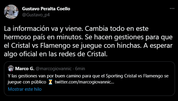 Sin embargo, desde la cúpula más cercana a la Federación Peruana de Fútbol, hay una versión distinta. La cual comparte el periodista Gustavo Peralta del ‘Diario Líbero’ y ‘ESPN Perú’: “La información va y viene. Cambia todo en este hermoso país en minutos. Se hacen gestiones para que el Cristal vs. Flamengo se juegue con hinchas. A esperar algo oficial en las redes de Cristal”. La pregunta que nace aquí es: ¿A quién le creemos? Queda esperar un poco más.