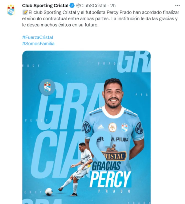 “El club Sporting Cristal y el futbolista Percy Prado han acordado finalizar el vínculo contractual entre ambas partes. La institución le da las gracias y le desea muchos éxitos en su futuro”, publicó el club rimense en sus redes sociales.