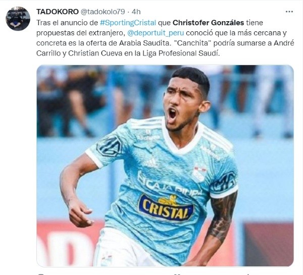 Según indica el diario Depor, el volante de Sporting Cristal tendría una oferta concreta para jugar en el extranjero, la cual sería desde la Liga Profesional Saudí, donde ya muestran su fútbol André Carrilloy Christian Cueva. Esta sería una opción para queChristofer Gonzales pueda dar el salto al extranjero nuevamente e intente consolidarse.