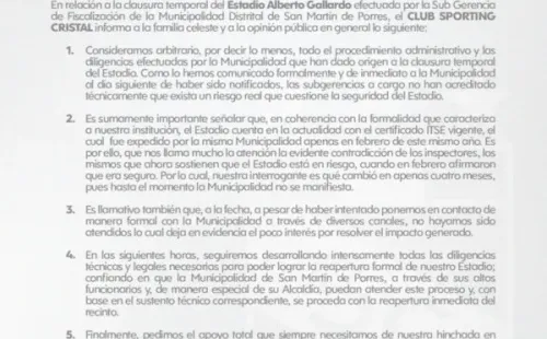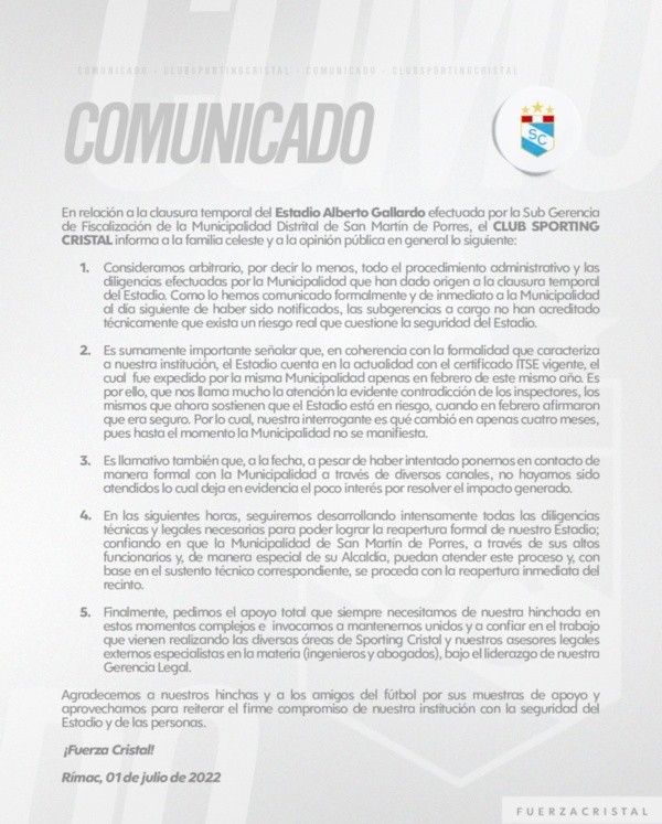 “Consideramos arbitrario todo el procedimiento administrativo y las diligencias efectuadas por la Municipalidad que han dado origen a la clausura temporal del Estadio. Las subgerencias a cargo no han acreditado técnicamente que exista un riesgo real que cuestiona la seguridad del Estadio”, comentó en una primera parte la nota de prensa.