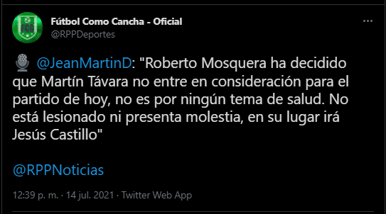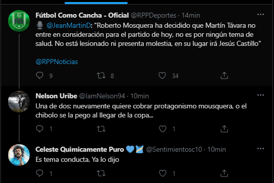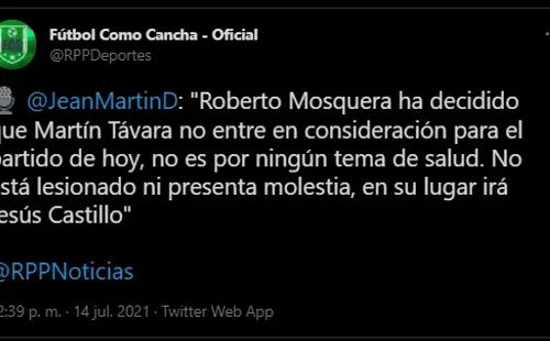 “Roberto Mosquera ha decidido que Martín Távara no entre en consideración para el partido de hoy, no es por ningún tema de salud. No está lesionado ni presenta molestia, en su lugar irá Jesús Castillo”. Con esto todo está definido, Sporting Cristal no contará con un referente, pero mantiene en línea la buena conducta por encima de todo. Veremos cómo le va al profesor Roberto Mosquera con este dictamen.