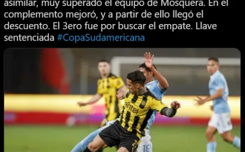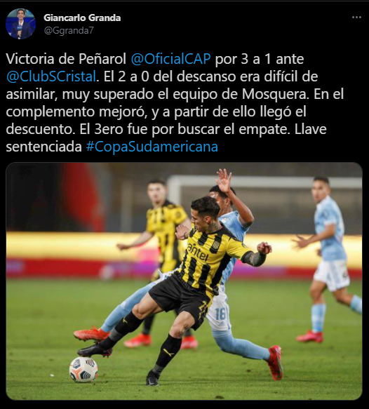 “Victoria de Peñarol por 3 a 1 ante Sporting Cristal. El 2 a 0 del descanso era difícil de asimilar, muy superado el equipo de Mosquera. En el complemento mejoró, y a partir de ello llegó el descuento. El tercero fue por buscar el empate. Llave sentenciada”. Propuso ‘El Flaco’.