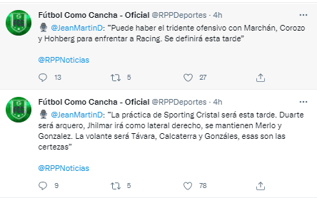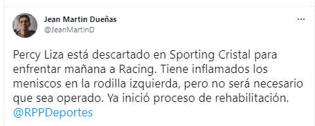 Quien sí está completamente descartado por lesión es Percy Liza: “está descartado en Sporting Cristal para enfrentar mañana a Racing. Tiene inflamados los meniscos en la rodilla izquierda, pero no será necesario que sea operado. Ya inició proceso de rehabilitación”. Sostuvo el periodista de ‘Fútbol Como Cancha’.