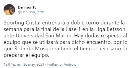 Según la información que brinda el periodista peruano; Denilson Jardel: “Sporting Cristal entrenará a doble turno durante la semana para la final de la Fase 1 en la Liga Betsson ante Universidad San Martín. Hay dudas respecto al equipo que se utilizará para dicho encuentro, por lo que Roberto Mosquera tiene el tiempo necesario de preparar el equipo”.