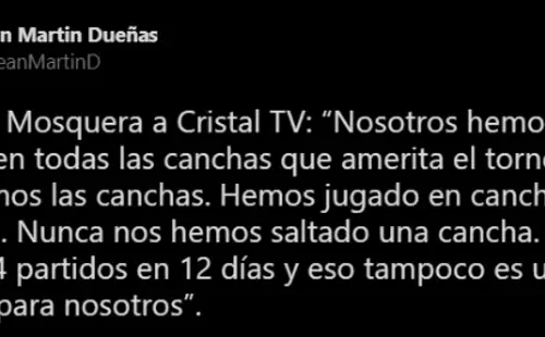 Roberto Martínez esta señala puso en tela de juicio el trabajo de Mosquera fuera de las canchas: “Es lamentable que se ponga en tela de juicio la honra porque se está diciendo que estamos tomando alguna ventaja competitiva que no necesitamos, y que históricamente no lo ha hecho Sporting Cristal. Nosotros hemos jugado en todas las canchas del torneo”.