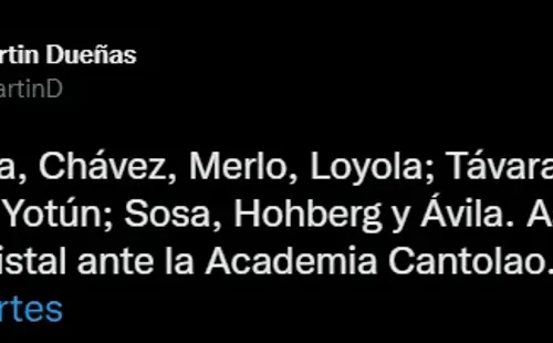 Sporting Cristal contra la Academia Deportiva Cantolao, desde el arranque saldrá con estos jugadores importantes para ganarlo al inicio: “Duarte; Lora, Chávez, Merlo, Loyola; Távara, Calcaterra, Yotún; Sosa, Hohberg y Ávila. Así forma Sporting Cristal ante la Academia Cantolao”. Deberá anotar el cuerpo técnico del cuadro de ‘La Punta’.