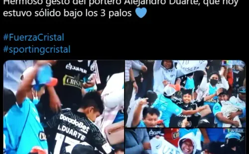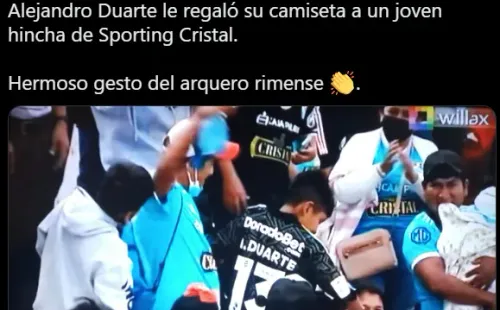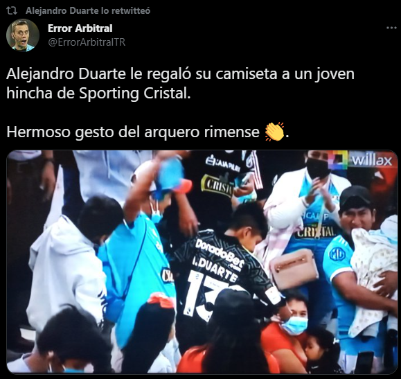 Además, también en Twitter, ‘Error Arbitral’ le dio una felicitación al ex Juan Aurich y Club San Martín: “Alejandro Duarte le regaló su camiseta a un joven hincha de Sporting Cristal. Hermoso gesto del arquero rimense”. Y obviamente, el portero orgulloso por lo hecho, le dio la respectiva compartida. Bien hecho Alejandro Duarte, tienes todo nuestro respeto.