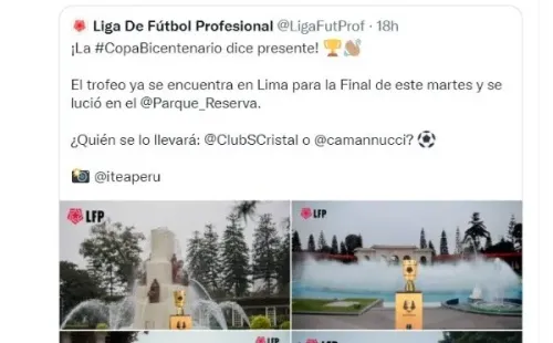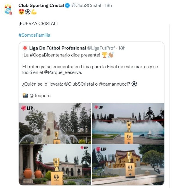 Con dos finales en lo que va del año, Sporting Cristal llegó al duelo decisivo de la Copa Bicentenario y, anteriormente, ganóla primera etapa de la Fase 1 de la Liga 1. Venciendo a laSan Martín,se hicieron con el título de la parte inicial del torneo. Y ahora, se enfrentarán el próximo martes 27 de julio ante Carlos A. Mannucci, a las 7:00 pm, en el estadio Alejandro Villanueva.