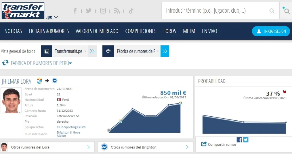 Tratándose del cuadro del Brighton & Hove Albion, que recientemente vendió al argentino Alexis Mac Allister al Liverpool, según Transfermarkt, quieren a Jhilmar Lora.