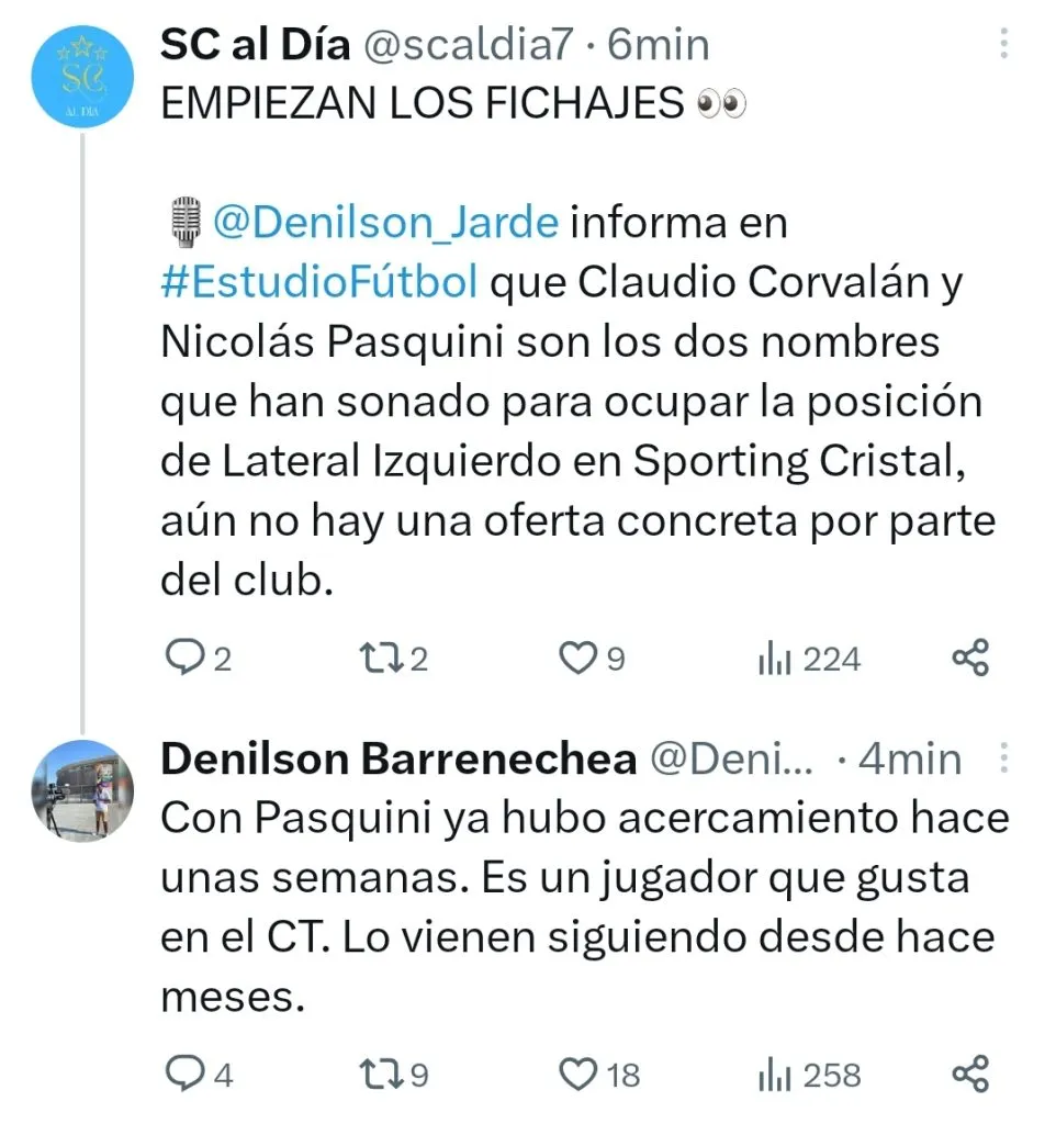 Siendo respondido por Denilson Barrenechea, el periodista dio más información: “Con Pasquini ya hubo acercamiento hace unas semanas. Es un jugador que gusta en el CT. Lo vienen siguiendo desde hace meses”.
