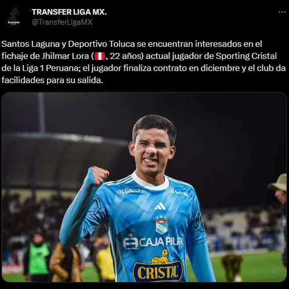 “Santos Laguna y Deportivo Toluca se encuentran interesados en el fichaje de Jhilmar Lora (peruano 22 años) actual jugador de Sporting Cristal de la Liga 1 Peruana; el jugador finaliza contrato en diciembre y el club da facilidades para su salida”, expone la cuenta especialista en mercado de pases. ¿Se dará? Esperemos por el bien de todos, que sea así.