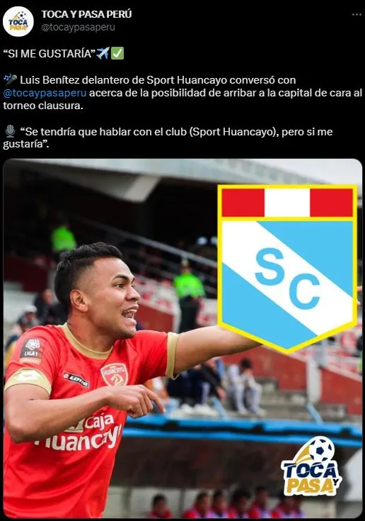 ¿Y por qué el titular de nosotros? Horas después, El Chin habló con Toca y Pasa Perú, y le preguntaron por la chance de jugar en un grande como Sporting Cristal. Contestando de la siguiente forma: “Se tendría que hablar con el club (Sport Huancayo), pero sí me gustaría”. ¿Lo ven siendo dirigido por Tiago Nunes?