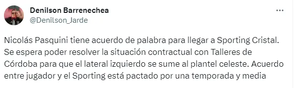 “Nicolás Pasquini tiene acuerdo de palabra para llegar a Sporting Cristal. Se espera poder resolver la situación contractual con Talleres de Córdoba para que el lateral izquierdo se sume al plantel celeste. El acuerdo entre el jugador y el Sporting está pactado por una temporada y media”, escribió el comunicador.