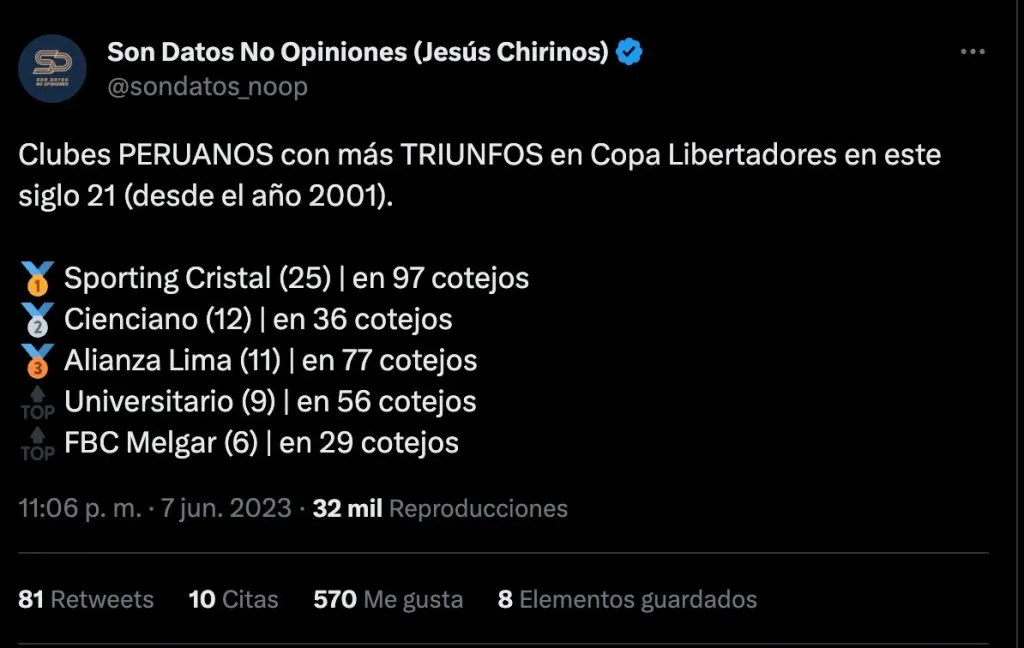 Con esta información, el hincha de Sporting Cristal puede inflar el pecho sobre los de Alianza y Universitario, sus grandes rivales.