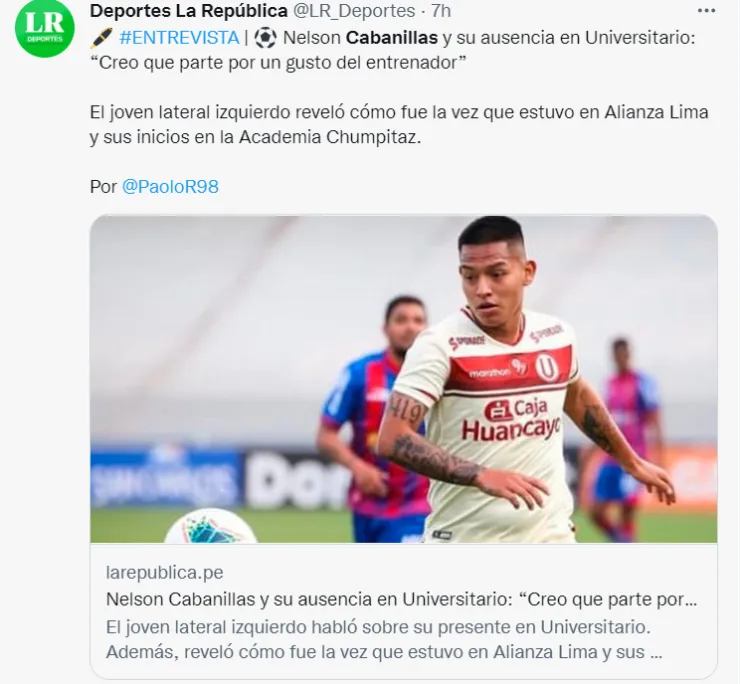 Nelson Cabanillasera uno de los titulares indiscutibles enUniversitario de Deportesy hace un tiempo fue elegido como el mejor lateral izquierdo de Sudamérica(Sub-23) por la agenciaSofascore.Sin embargo, el lateral merengue no ha sido tomado en cuenta por el entrenadorJorge Araujo en las últimas fechas del Torneo Apertura dela Liga 1.