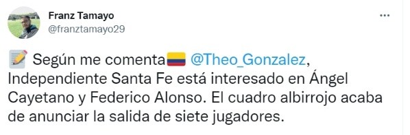 Los ‘Cremas’ cuentan con varios extranjeros en su plantilla, principalmente uruguayos. El periodista colombiano de ESPN, Theo Gonzáles dijo lo siguiente: “Independiente Santa Fe está interesado en Ángel Cayetano y Federico Alonso. El cuadro albirrojo acaba de anunciar la salida de siete jugadores”, dijo el comunicador sobre los futbolistas ‘Charrúas’.