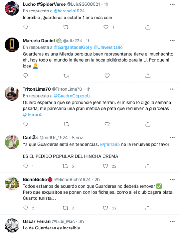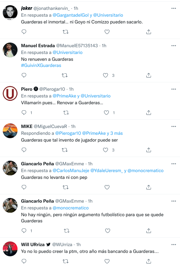 En las últimas horas, por ejemplo, se supo que Rafael Guarderas se quedaría un año más en el club. La información la dieron distintas fuentes vinculadas con el club, aunque no la cuenta oficial del equipo. Los aficionados, entonces, hicieron lo suyo.