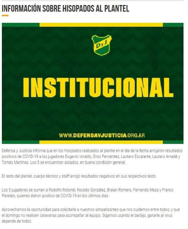 Luego del triunfo ante Universitario por 3-0, el parte médico del club argentino Defensa y Justicia informó que los futbolistasEugenio Isnaldo, Enzo Fernández, Lautaro Escalante, Lautaro Amadé y Tomás Martínez dieron positivo a coronavirus.