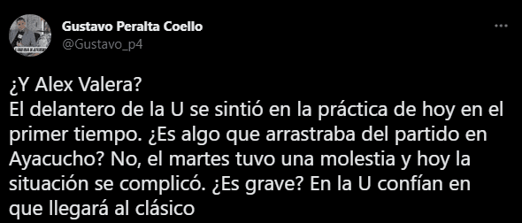 La ausencia de ‘Metralleta’ la explica el periodista del ‘Diario Líbero’, Gustavo Peralta, quien automáticamente explicó esta situación: “¿Y Alex Valera? El delantero de la U se sintió en la práctica de hoy en el primer tiempo. ¿Es algo que arrastraba del partido en Ayacucho? No, el martes tuvo una molestia y hoy la situación se complicó. ¿Es grave? En la U confían en que llegará al clásico”.