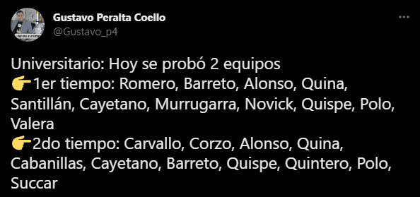 Minutos antes de este hecho, había planteado lo que trabajaron esta mañana en ‘Campo Mar U’: “Universitario: Hoy se probó 2 equipos. 1.er tiempo: Romero, Barreto, Alonso, Quina, Santillán, Cayetano, Murrugarra, Novick, Quispe, Polo, Valera. 2.º tiempo: Carvallo, Corzo, Alonso, Quina, Cabanillas, Cayetano, Barreto, Quispe, Quintero, Polo, Succar”. Las próximas horas serán claves.