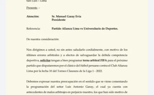 Siendo específicos en el tema, Universitario de Deportes publicó una carta en sus redes sociales. Teniendo el carácter de pedido, la misiva solicitaba que no se programe al árbitro Luis Garay en el enfrentamiento ante Alianza Lima de este domingo 4 de septiembre.