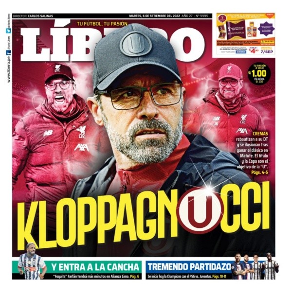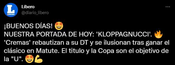 Así fue presentado el ‘Diario Líbero’ hoy, con el siguiente mensaje: “¡BUENOS DÍAS! NUESTRA PORTADA DE HOY: ‘KLOPPAGNUCCI’. ‘Cremas’ rebautizan a su DT y se ilusionan tras ganar el clásico en Matute. El título y la Copa son el objetivo de la “U”. Por si aún no lo habían visto, te lo hacemos presente, se hizo viral de forma inmediata. Con los comentarios más ácidos de por medio, pase y vea, analice. Y si quiere, comente, todo queda bajo su propia responsabilidad. No se enojen con el mensajero, hacemos hincapié.