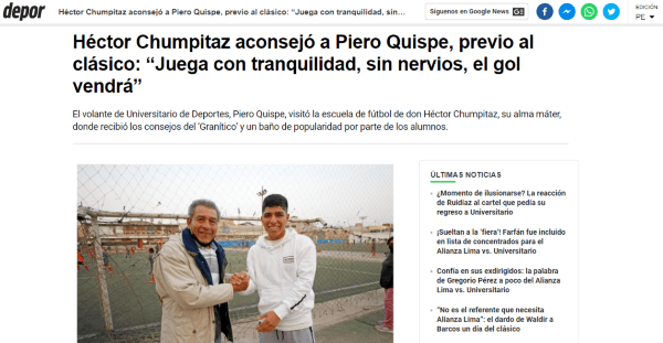 El ídolo del fútbol peruano, pero arraigado con camiseta de Universitario de Deportes, habló en la previa del clásico del balompié local. Don Héctor Chumpitaz tuvo palabras cercanas con uno de sus pupilos, un jugador que hoy da la hora en el cuadro ‘merengue’ por su presente, y auspicioso futuro. Piero Quispe recibió cariño por parte del ‘Granítico’, quien charló con el ‘Diario Depor’, antes del duelo contra Alianza Lima.
