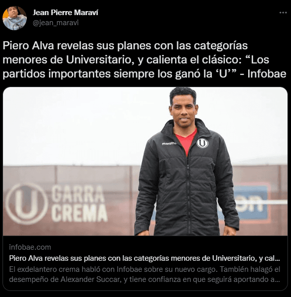 Así lo definió Piero Alva, el duelo entre ‘blanquiazules’ y ‘merengues’, con mucho respeto, y referenciando el cargo que ahora mismo maneja dentro de la institución “Es el partido más importante para los hinchas de ambos equipos, y siempre esperado por todos. Siempre es una semana especial, de esa tensión linda porque llegue la hora de juego. Esperemos que los chicos de Universitario sigan demostrando el crecimiento que se viene dando, y después disfrutar”.