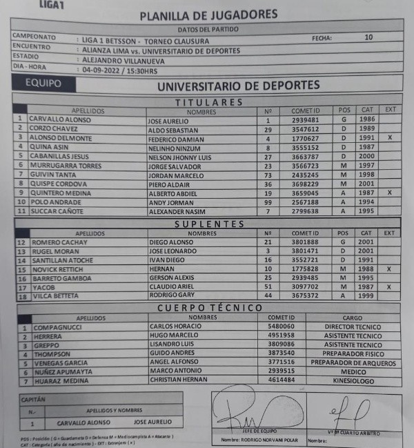 Desde las (3:30 PM – HORA PERUANA), en el ‘Estadio de Matute’, los ‘cremas’ irán con el siguiente equipo titular. La información exclusiva la presenta el periodista del Diario Líbero y PBO Campeonísimo, Gustavo Peralta: “Así irá Universitario de Deportes en el clásico: Carvallo, Corzo, Alonso, Quina, Cabanillas, Murrugarra, Guivin, Polo, Quintero, Quispe y Succar”.