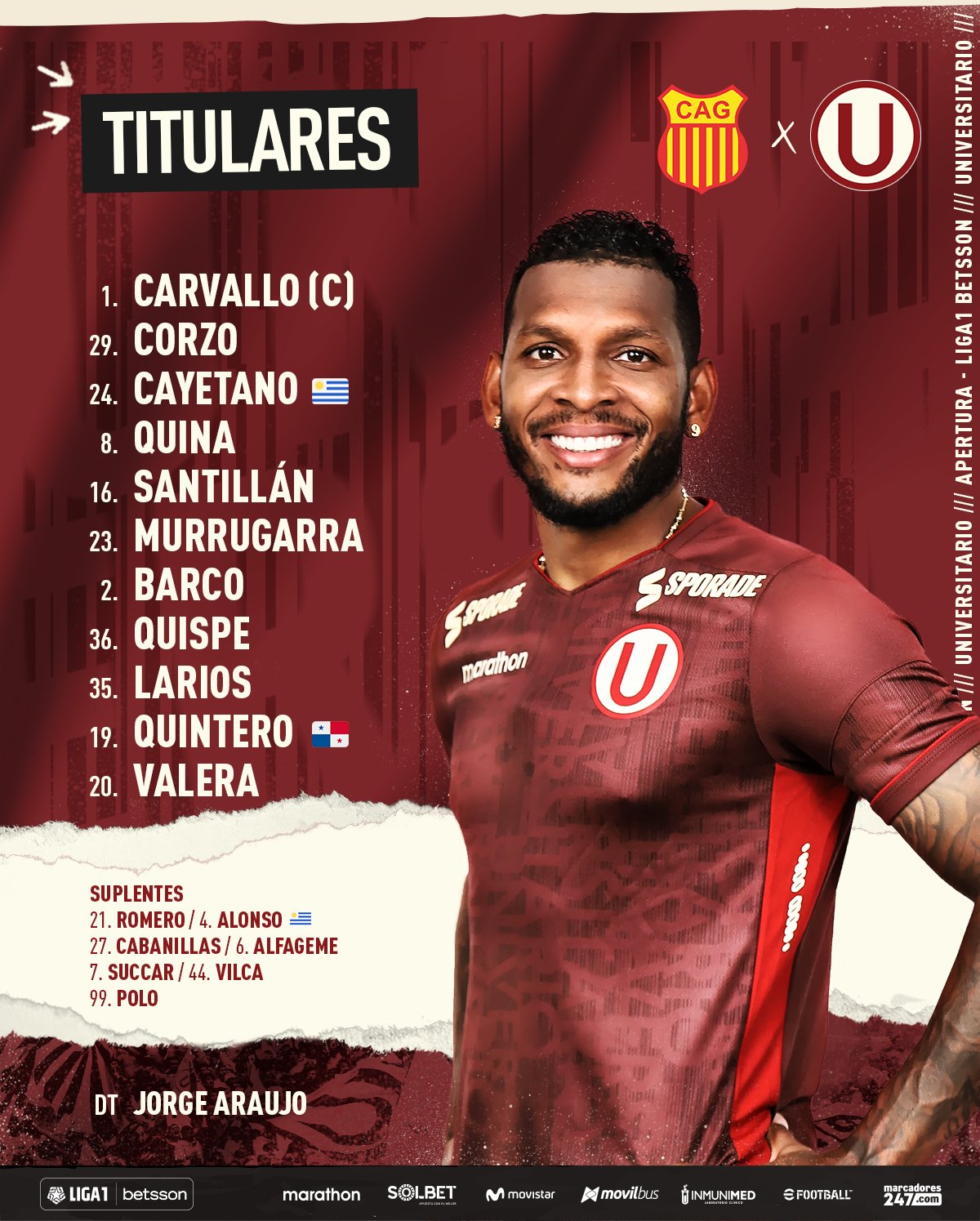 La gran sorpresa es la ausencia del flamante refuerzo, Andy Polo, por molestias que lo sacan del once titular. Pero estará junto a su entrenador, Jorge ‘El Coco’ Araujo, en la zona de suplentes: “Romero, Alonso Cabanillas, Alfageme, Succar, Vilca y Polo”. Para esperar el momento oportuno, y marcar la diferencia como un revulsivo.