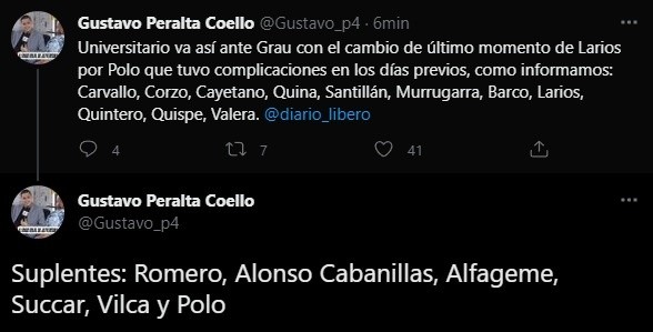 “Universitario va así ante Grau con el cambio de último momento de Larios por Polo, que tuvo complicaciones en los días previos, como informamos: Carvallo, Corzo, Cayetano, Quina, Santillán, Murrugarra, Barco, Larios, Quintero, Quispe, Valera”.